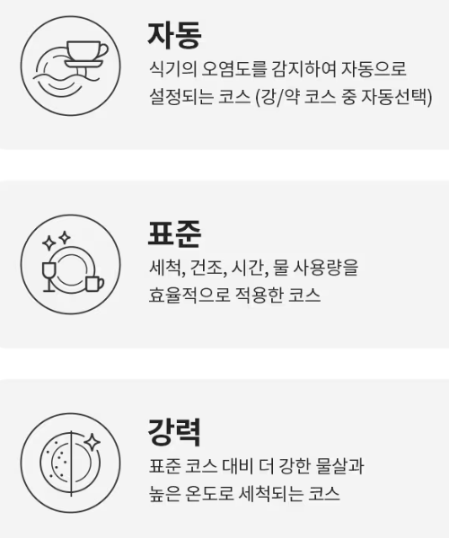 기름기 많은 식기,단단하게 눌어붙은 식기, 생선요리, 섬세, 스팀 리프레시, 헹굼 전용 등)