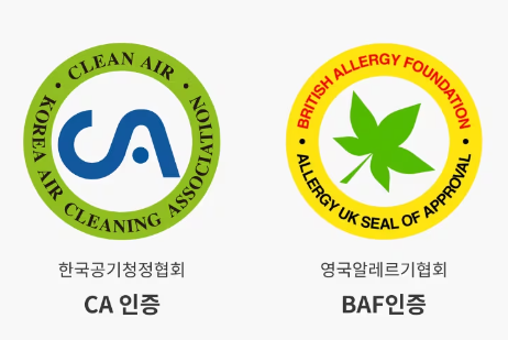 미세먼지 제거 능력, 유해가스 제거율, 오존 발생량, 소음 기준을 통과한 제품에만 부여하는 CA인증을 비롯하여 다양한 인증을 획득했어요