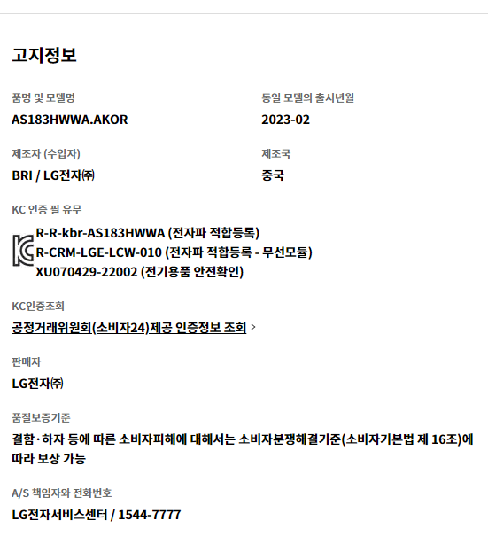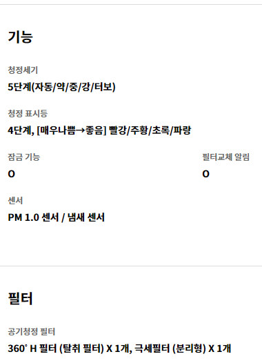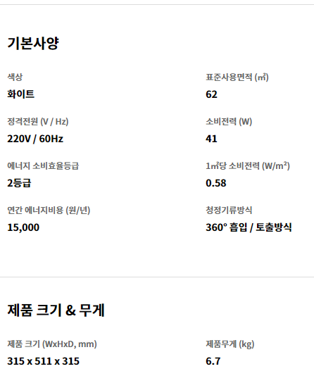 LG 퓨리케어 360˚ 공기청정기 Hit AS183HWWA 상세 스펙
