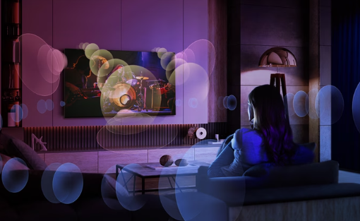 공간감이 느껴지는 입체 사운드. 사운드를 인식하고 음성과 배경음을 분리해 마치 버추얼 스피커가 있는 것처럼 더욱 공간감이 느껴지는 입체적인 사운드를 구현합니다.