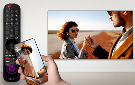 휴대폰을 리모컨에 가져다 대면 휴대폰으로 보던 영화, 저장된 사진/영상을 TV로 크게 볼 수 있고 TV 소리를 휴대폰으로 들을 수 있어요.