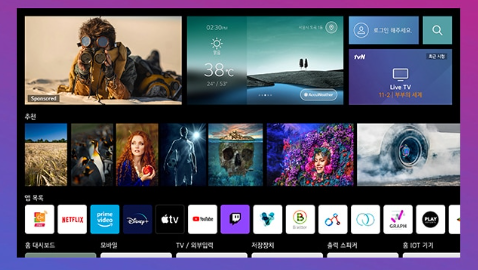 쉽게 찾고 바로 보는 TV 이상의 즐거움. LG 채널, 넷플릭스, 왓챠, 유튜브 등 다양한 앱을 바로 실행하고 지금 인기 있는 콘텐츠, 날씨, 가전 상태까지 한눈에 확인할 수 있어 TV 이상의 즐거움을 드립니다.