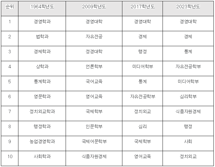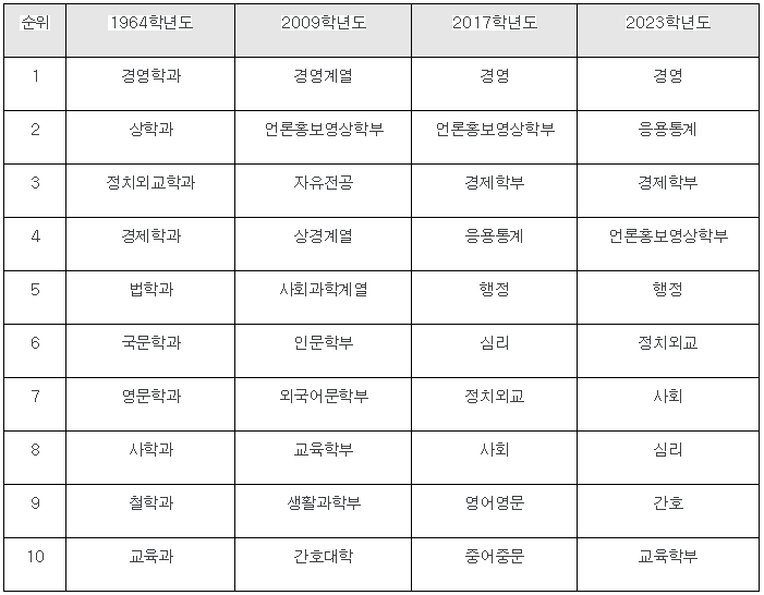 인문계열은 자연계열에 비해 인기학과의 연도별 변동이 크지 않았다. 60년대부터 경영학과와 경제학과 등 상경계열 학과와 사회과학계열 학과의 인기는 현재까지 지속되고 있는 것이다.