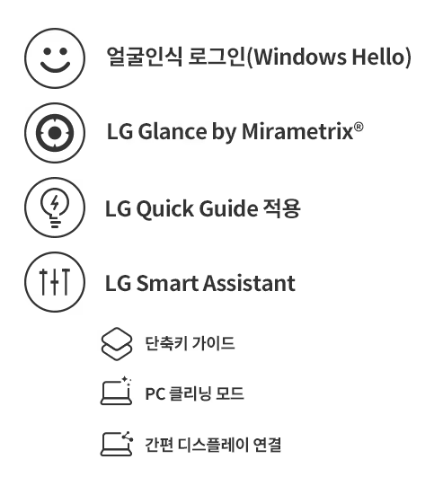 그램의 신규 UX(사용자 경험)는 새로움에 편리함까지 더해줍니다.생체 인식(얼굴인식)으로 자동 로그인하고 얼굴·시선 감지로 마우스 커서를 이동할 수도 있고,LG Quick Guide를 통해 다양한 소프트웨어의 사용법도 쉽게 알아볼 수 있죠.단축키 가이드를 한눈에 보고, PC가 켜진 상태에서 마음 놓고 청소하세요.