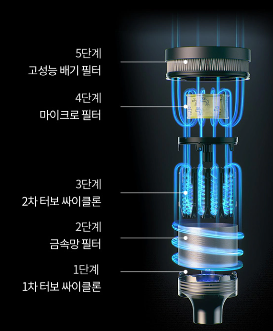 2중 터보 싸이클론으로 형성된 강력한 회오리로 공기와 먼지를 평균 99.6%까지 분리하고효율적인 공기 흐름으로 강력한 흡입력을 발휘합니다.