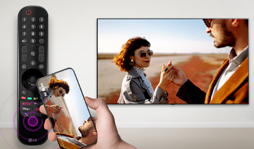 휴대폰을 리모컨에 가져다 대면 휴대폰으로 보던 영화, 저장된 사진/영상을 TV로 크게 볼 수 있고 TV 소리를 휴대폰으로 들을 수 있습니다.