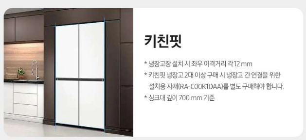BESPOKE 키친핏은 700 mm 깊이의 냉장고장 라인에 딱 맞게 들어가 빌트인처럼 연출 가능합니다.