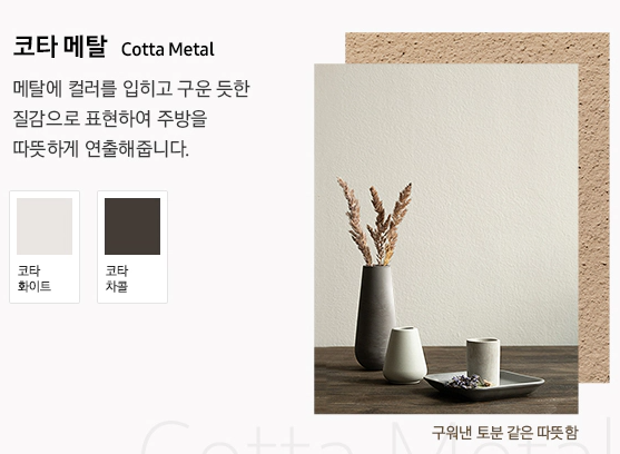 메탈에 컬러를 입히고 구운 듯한 질감으로 표현하여 주방을 따뜻하게 연출해줍니다.