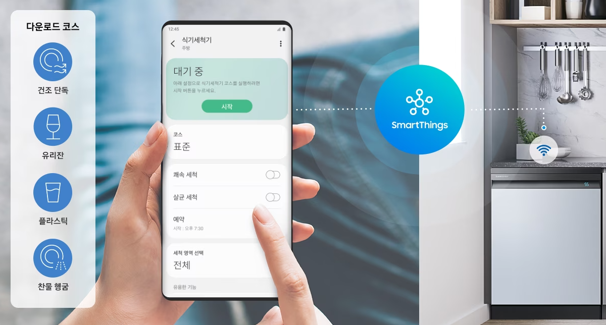 SmartThings 앱을 통해 원격으로 코스와 옵션을 선택해 동작시킬 수 있습니다.
