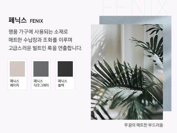 명품 가구에 사용되는 소재로 메트한 수납장과 조화를 이루며 고급스러운 빌트인 룩을 연출합니다.