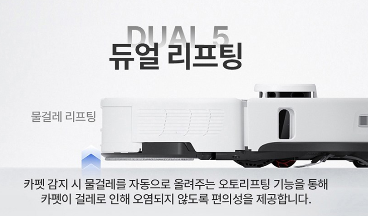 그리고 걸레 헤드와 회전 브러시를 자동으로 들어 올리는 기능을 제공합니다. 이 기능은 다른 로봇 진공청소기에서는 없는 기능으로 이를 통해 진공 청소기로 청소할 때 걸레를 들어 올려 청소에 방해가 되지 않도록 하고, 걸레질을 할 때는 브러시를 들어 올려 청소에 방해되지 않도록 합니다. 그리고 카펫 등을 청소할 때 자동으로 걸레를 들어 올리기 때문에 카펫 등에 생길 수 있는 얼룩 등을 방지할 수 있습니다.