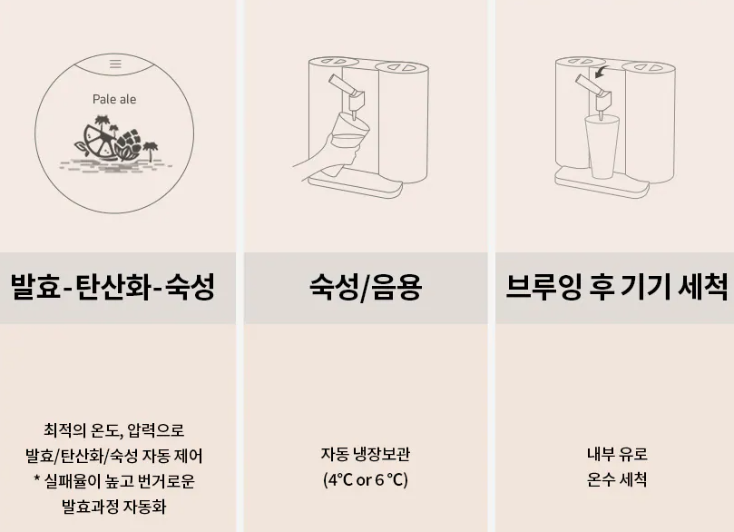 발효, 탄산화, 숙성에 최적의 알고리즘을 기반으로 최적의 온도, 압력, 기간을 자동 제어해 약 10일만에 약 5리터의 수제맥주를 만듭니다