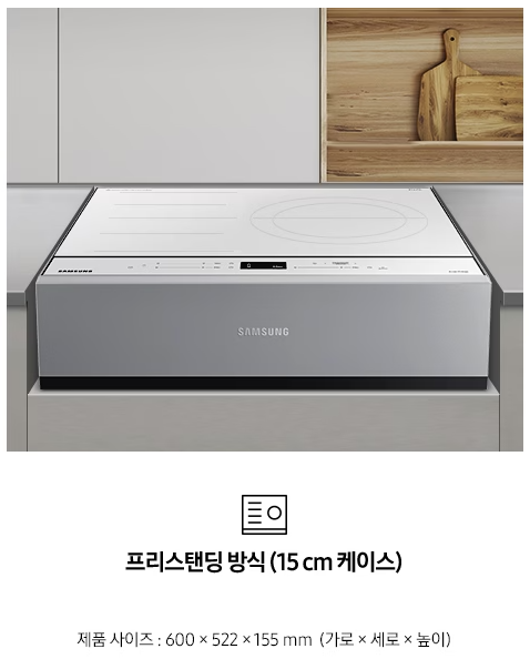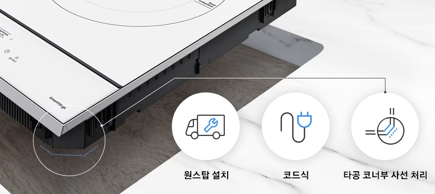 또한 파워케이블만 꽂으면 되는 코드식 타입에, 제품 하단부는 사선 처리되어 있어 빌트인 가스레인지와 교체 후 끼우기만 하면 손쉽게 설치할 수 있습니다.
