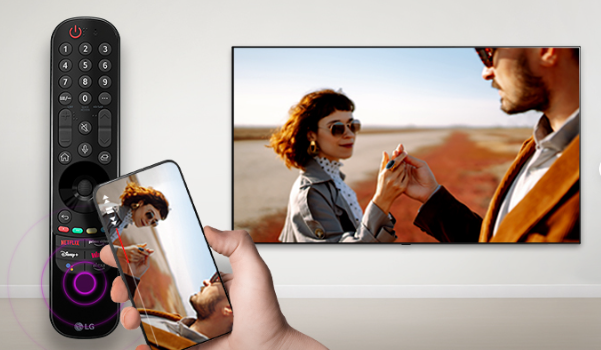 휴대폰을 리모컨에 탭 하면 휴대폰으로 보던 영화, 휴대폰에 저장된 사진/영상을 TV에서 크게 볼 수 있고 TV 소리를 휴대폰으로 들을 수 있습니다.