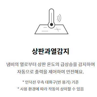 - 안전장치 세부항목220℃ 내열 코일, Fan Lock 안전장치, 고/저전압 보호설계, 고성능 단열재, 변속 쿨링팬, 분리벽 코일 설계, 상판 과열 방지, 소프트웨어 안전인증(KTL), 시간제어, 용기감지, 일시낮춤, 잔열표시 "H", 잠금기능, 전류퓨즈, 전원 자동 OFF, 정전기 방지 시스템, 출력제어, 코일 감지 센서, 쿨링 에어가이드 설계, 타이머, 화구 자동 OFF