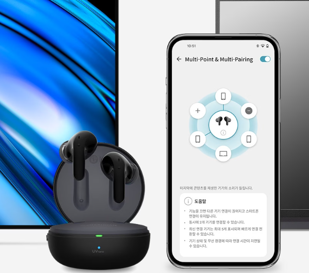 톤 프리 앱으로 최대 2대까지 멀티포인트, 최대 5대까지 멀티페어링이 가능합니다.
