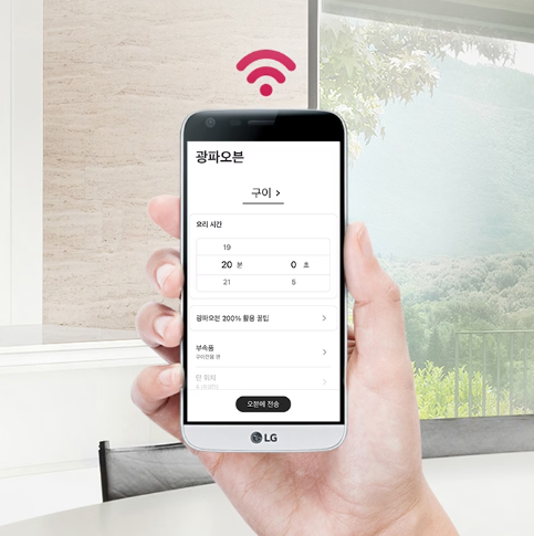 광파오븐에 내장된 Wi-Fi 기능으로 원격세팅이 가능하여 스마트폰을 리모컨처럼 더 쉽고 간편하게 요리하세요.