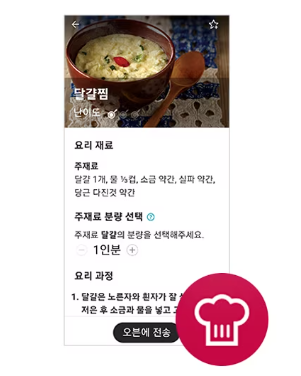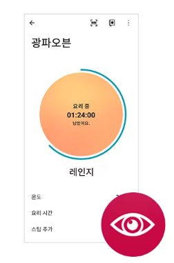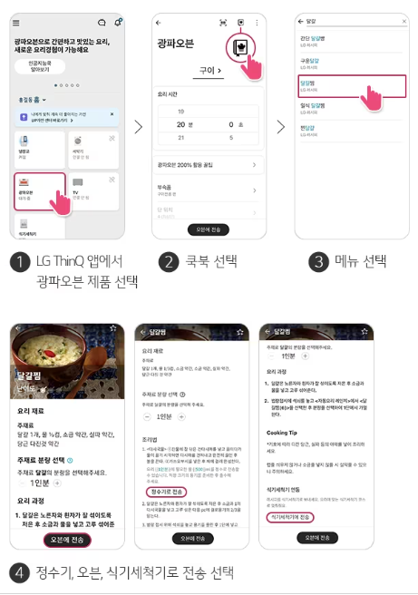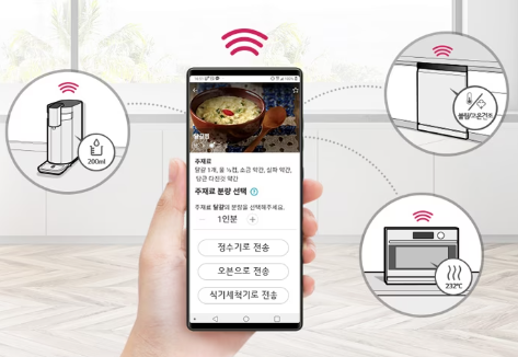 LG ThinQ 앱으로 원하는 요리 레시피를 선택하면해당 요리에 맞게 오븐의 온도 및 시간, 필요한 정수기 물의 양, 식기세척기 추천 코스를 알아서 설정해 주어요리가 더 편리해집니다.