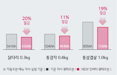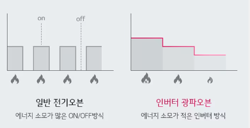 기존 전기오븐은 설정 온도를 맞추고 유지하기 위하여시스템 On/Off를 반복하기 때문에 낭비되는 에너지가크지만 인버터 광파오븐은 정밀한 출력제어가가능하기 때문에 에너지 손실을 최소화하는 동시에,더 빠르고 맛있는 요리가 가능합니다.