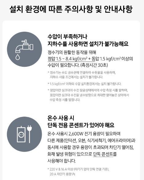 - 소비 전력냉수 : 0.75A / 온수 : 2,600W
