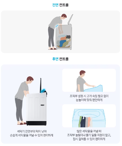 세탁물을 꺼내기 쉽고 조작부에 물기 닿을 걱정이 없어요.