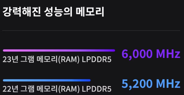 CPU 명령을 실행하는 메모리(RAM)가 LPDDR5 5,200 메모리 대비 약 15% 빨라졌습니다.