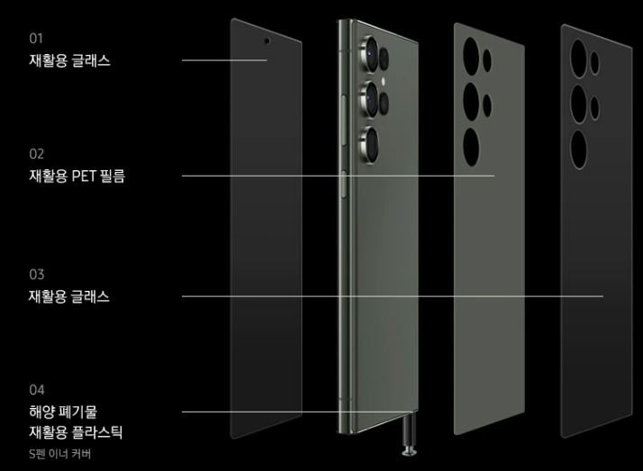 재활용 글래스, 재활용 PET 필름 등 자연을 생각하는 소재로 완성한 갤럭시 S23 Ultra를 100 % 재활용 종이 박스에 담아 전합니다.